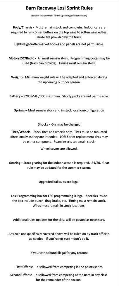Track: The Barn Raceway has final say regarding rules. The Barn Raceway reserves the right to remove a racer from the program's lineup for actions that may be deemed illegal, inappropriate, or otherwise not in the good nature of our hobby. Remember - this hobby is meant for enjoyment and fun. If you are affecting other racers ability to enjoy themselves, you will be removed from our race program's lineup and disqualified from the event. These rules are meant as a structure/guideline. Please ask track management for any rule not specifically stated above.